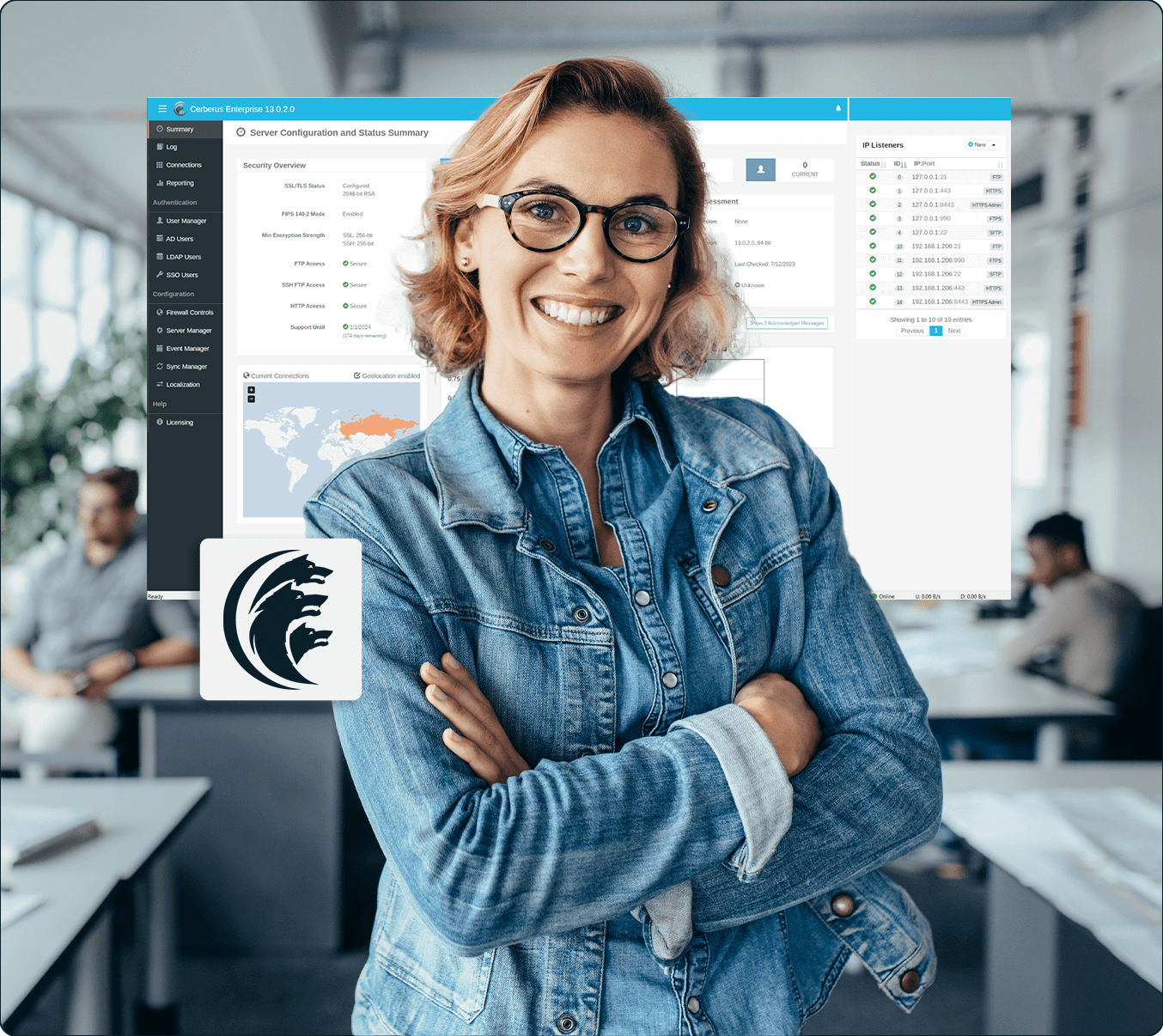 Engineered for ease of use, Cerberus FTP Server offers highly secure file transfers with turnkey installation and management.